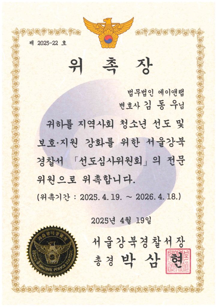 김동우 변호사는 2025년 4월 19일 서울강북경찰서 「선도심사위원회 전문위원」으로 위촉되었습니다.